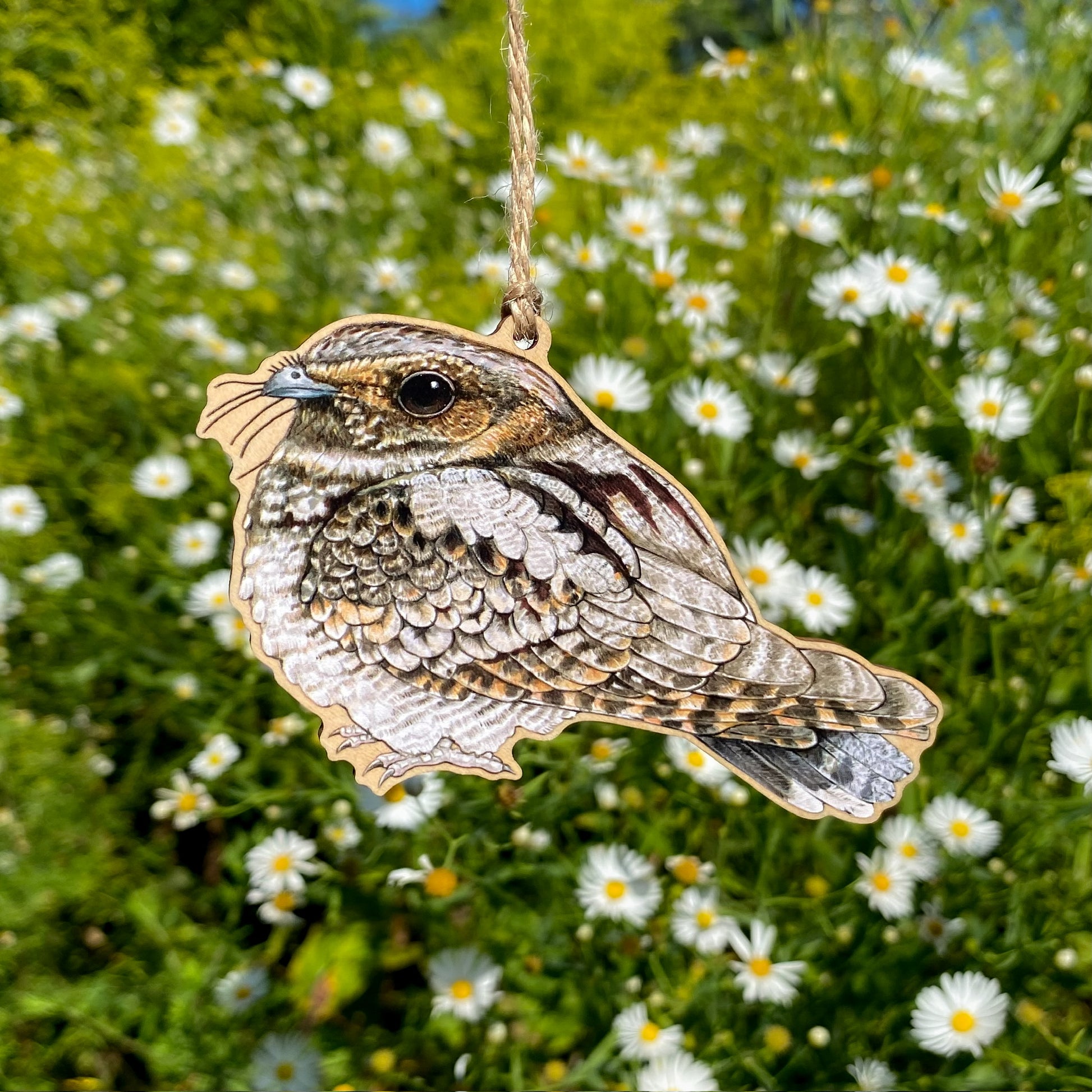 This wood print ornament features my illustration of an eastern whip-poor-will.